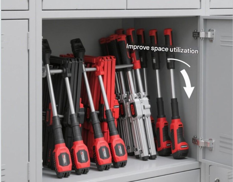 Phù hợp với nhiều môi trường lưu trữ khác nhau: Dù là gara gia đình, phòng dụng cụ hay khu vực chứa đồ tại nơi làm việc, thiết bị có thiết kế trục gấp có thể dễ dàng thích ứng, giúp người dùng thuận tiện cất giữ, quản lý theo nhu cầu thực tế.