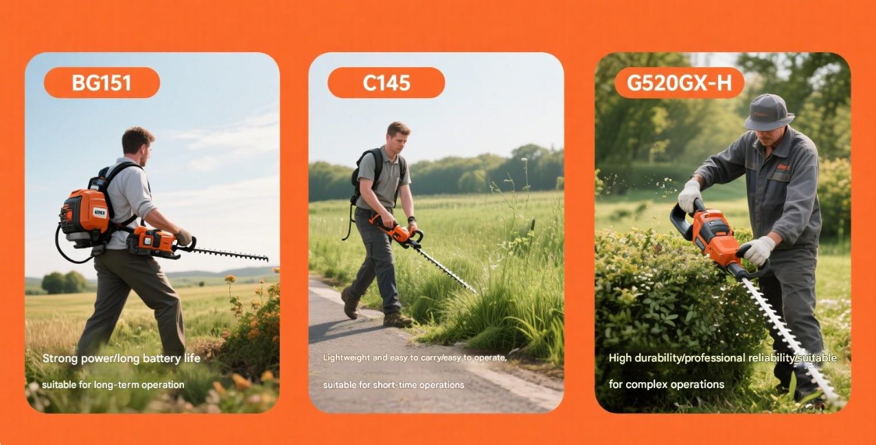 Cắt cỏ diện tích nhỏ: Đối với những khu vườn nhỏ và cỏ dại ven đường, bạn có thể lựa chọn dòng máy cắt cỏ cầm tay như CG145 Brushcutter và Brush Cutte CG430B. Những mẫu máy này nhẹ, dễ mang theo, dễ vận hành, thích hợp cho các hoạt động ngắn hạn và có thể dễ dàng đáp ứng nhu cầu cắt cỏ ở những khu vực nhỏ.