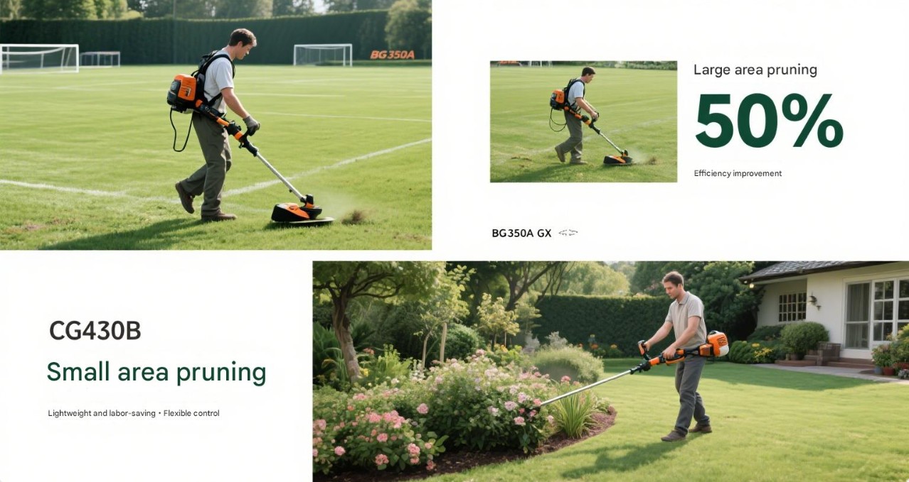 Cắt cỏ diện tích lớn: Để cắt cỏ ở những khu vực rộng lớn và địa hình phức tạp, nên chọn máy cắt cỏ ba lô, chẳng hạn như Máy cắt cỏ ba lô mạnh mẽ BG151 và Máy cắt cỏ ba chiều BG350A-GX Knapsack 4 thì. Những mẫu máy này mạnh mẽ và có thời lượng pin dài, phù hợp cho các hoạt động lâu dài và có thể hoàn thành hiệu quả các nhiệm vụ cắt cỏ trên diện rộng.