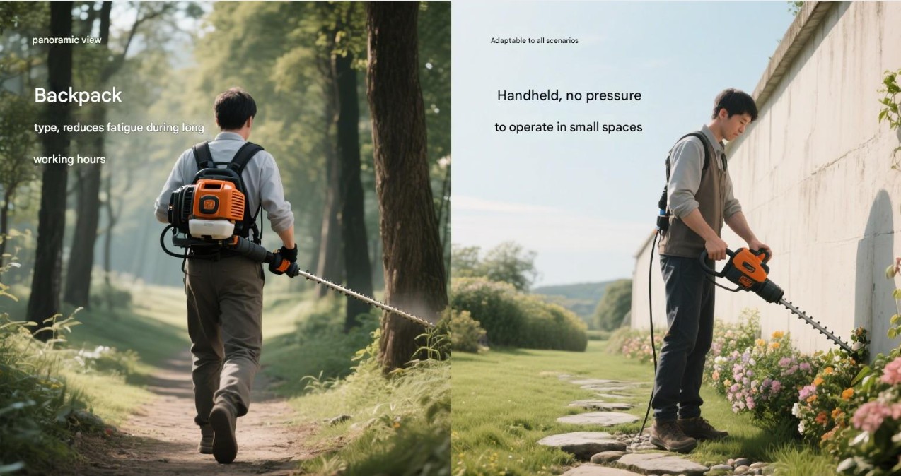 Thiết kế linh hoạt, đa dạng: Máy cắt cỏ chạy xăng thường có hai thiết kế là dạng đeo ba lô và dạng cầm tay, phù hợp cho các hoạt động làm vườn ở quy mô và địa hình khác nhau. Thiết kế ba lô phù hợp để cắt cỏ trên diện rộng và địa hình phức tạp, trong khi thiết kế cầm tay phù hợp với những khu vườn nhỏ và cỏ dại ven đường.