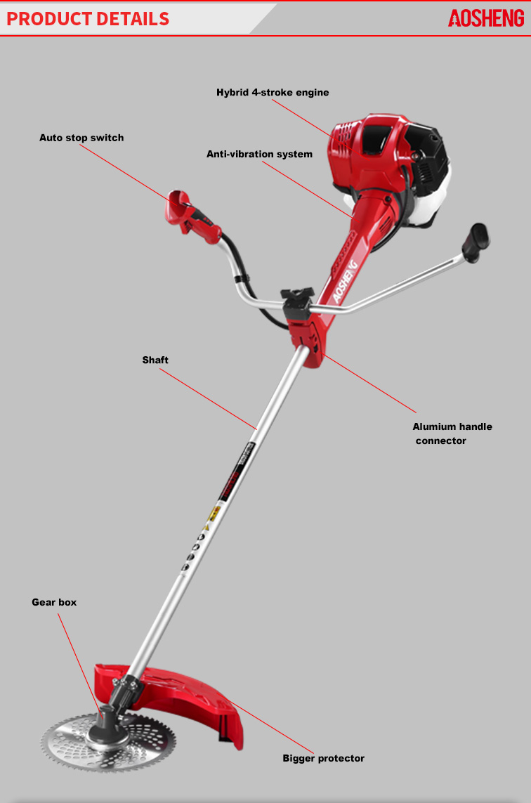 Động cơ 4 thì hiệu suất cao, chuyển vị là 38CC. Sử dụng chuyên nghiệp ở vùng đất hoang mở Kích thước ống 26mm * 1,5mm, trục linh hoạt chịu lực. Chiều rộng cắt là 420mm Tuổi thọ trên 150 gi...