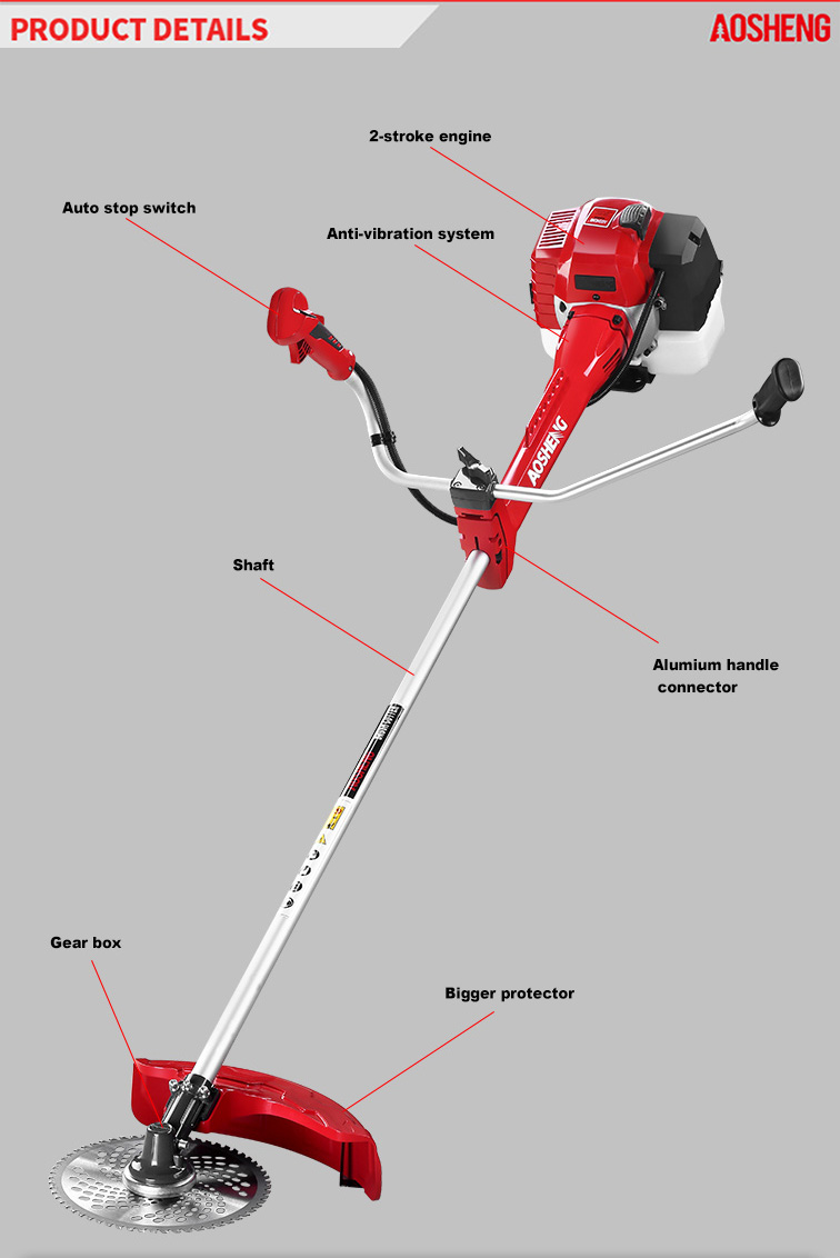 Động cơ 4 thì hiệu suất cao, chuyển vị là 38CC. Sử dụng chuyên nghiệp ở vùng đất hoang mở Kích thước ống 26mm * 1,5mm, trục linh hoạt chịu lực. Chiều rộng cắt là 420mm Tuổi thọ trên 150 gi...