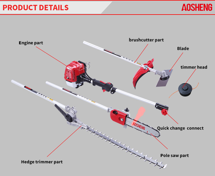 Máy cắt nhiều chổi bao gồm máy xén hàng rào, máy cưa cột và lưỡi cắt cầm tay.