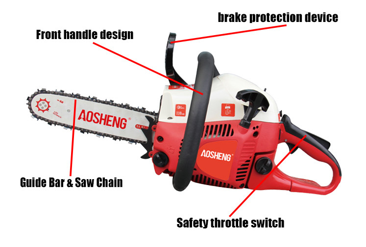 | 02THIẾT BỊ BẢO VỆ PHANHPhản ứng phanh nhạy cảm, cải thiện sự an toàn khi vận hành. Tay lái phía trước và tay lái phía sau được làm thành một, có kết cấu đơn giản và chắc chắn. Áp lực của thiết bị có thể dừng máy cưa xích. |